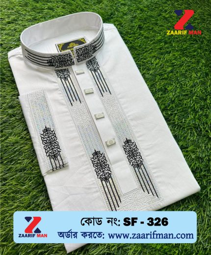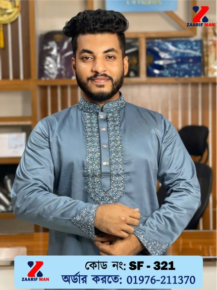 - ডিজাইন: সম্পূর্ণ পাঞ্জাবিতে রয়েছে চমৎকার এমব্রয়ডারি এবং সিকুয়েন্সের কাজ। হাতার নিচের অংশে রয়েছে বিশেষ মিনার ডিজাইন যা পাঞ্জাবিকে আরও আকর্ষণীয় করে তুলেছে